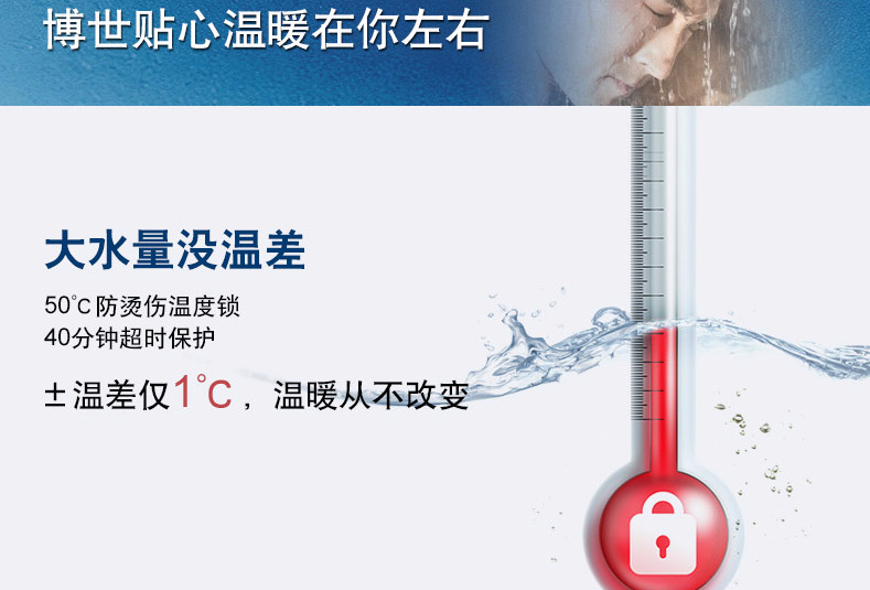 智能恒溫控制系統(tǒng),記憶合金先進(jìn)技術(shù),安全探測(cè)報(bào)警系統(tǒng),提供舒適安全沐浴。